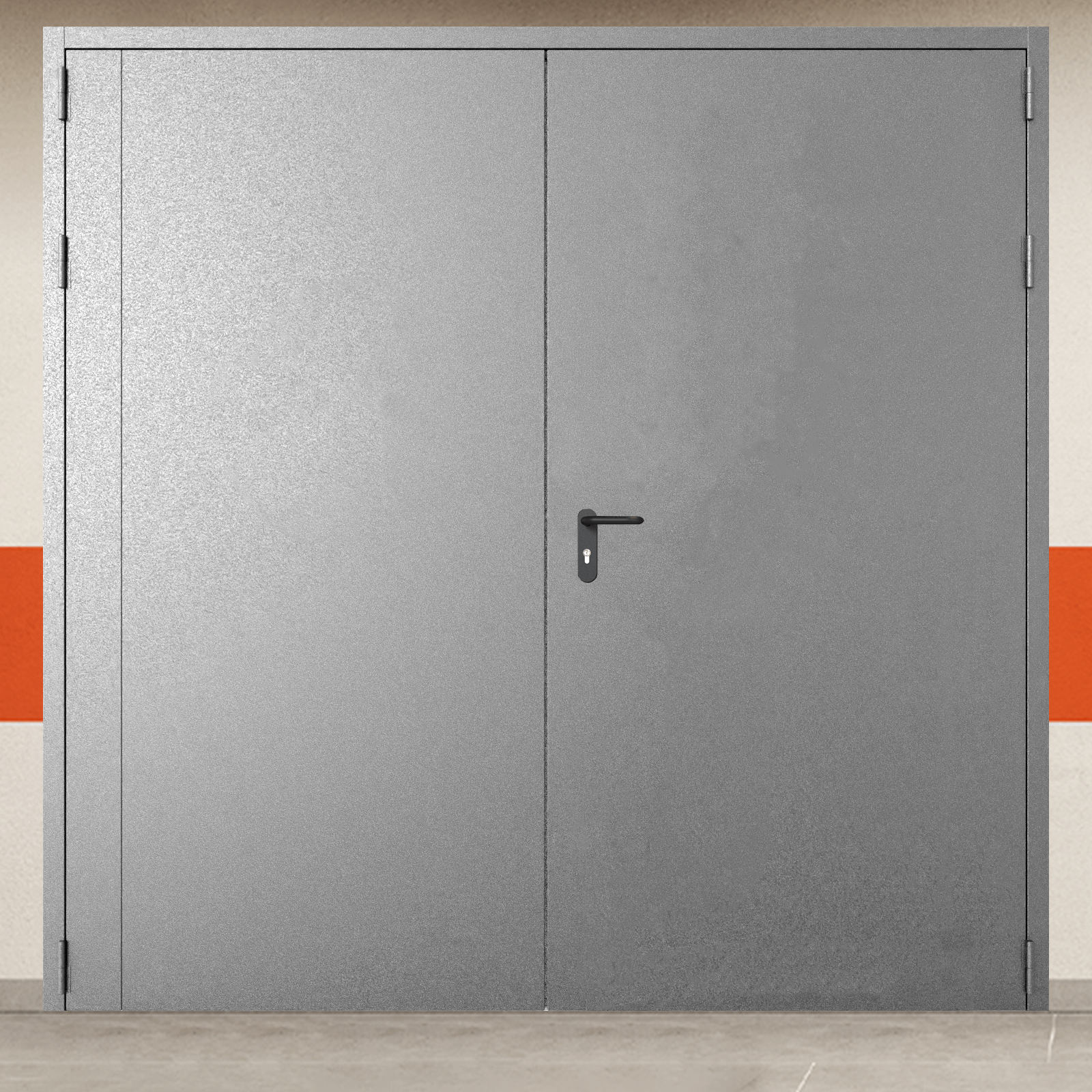 Высококачественное противопожарное оборудование - ворота металлические двустворчатые серые без доводчика промышленного класса для систем защиты объектов.