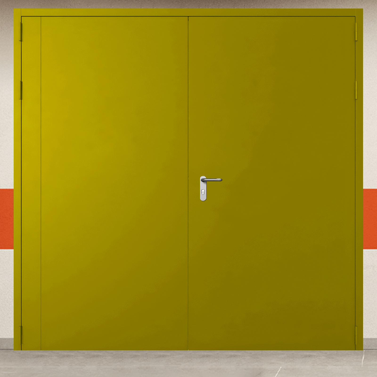 Высококачественное противопожарное оборудование - ворота металлические двустворчатые желтые с блестящей ручкой без доводчика промышленного класса для систем защиты объектов.