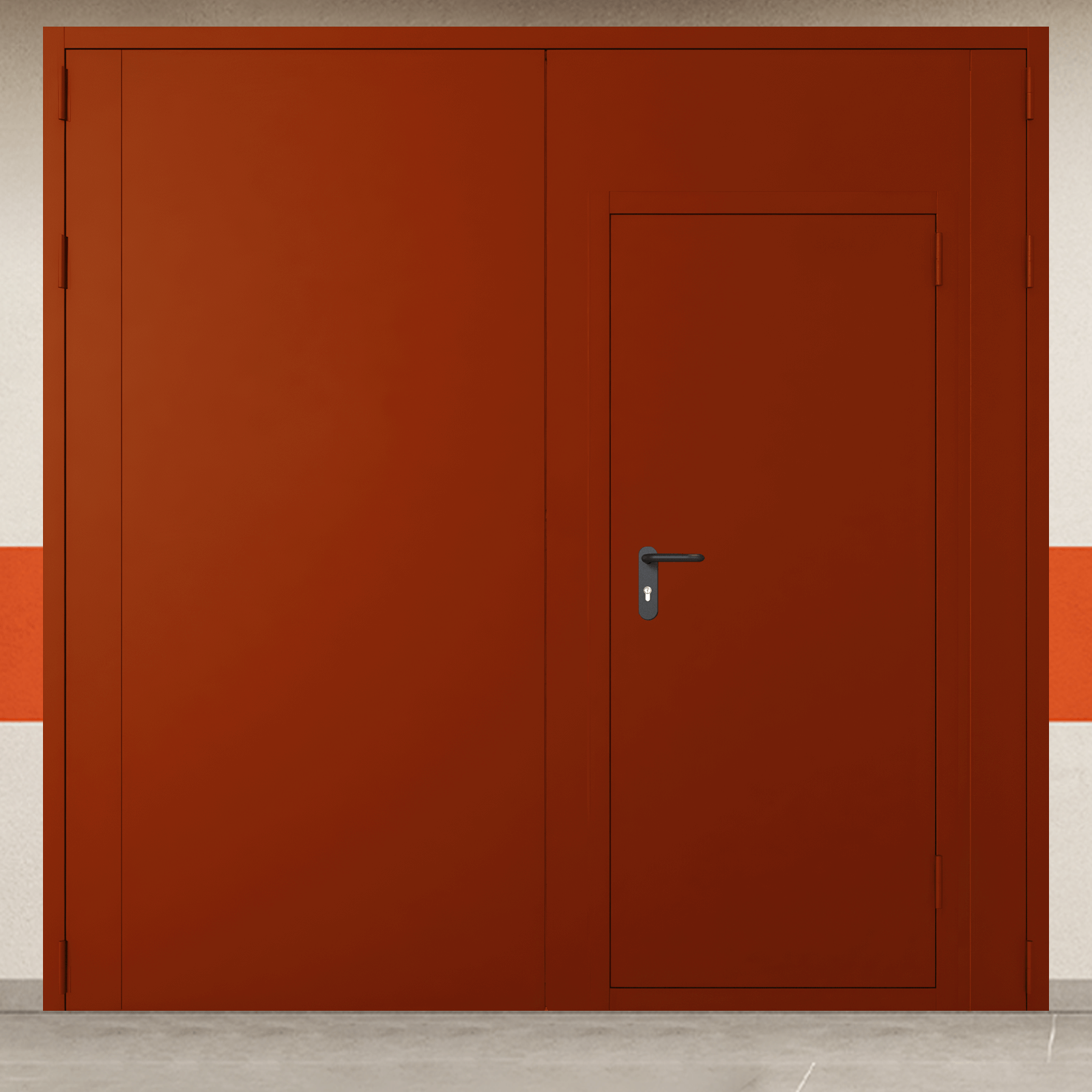 Специализированные ворота противопожарного назначения красного цвета, с дверью.