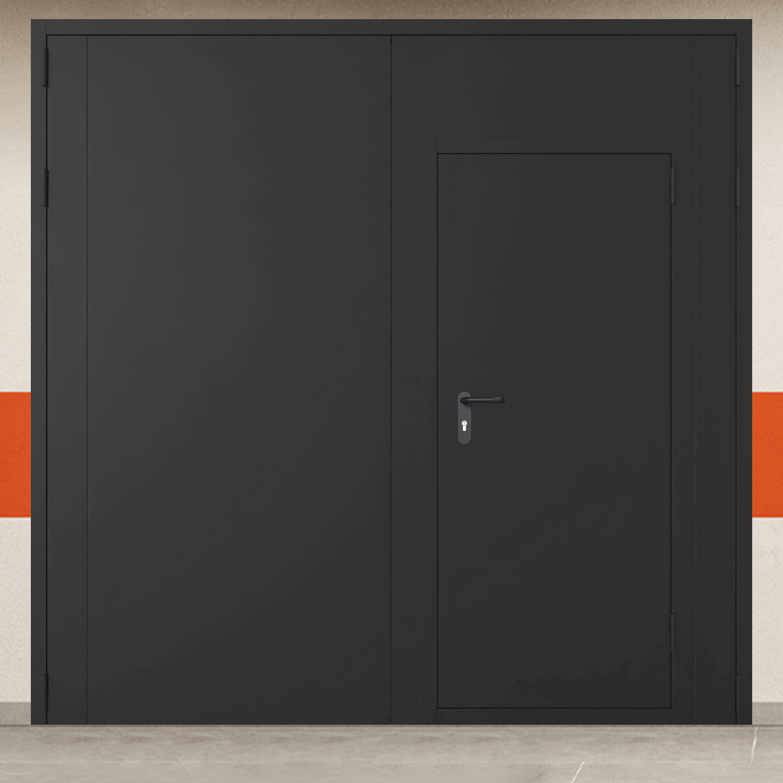 Металлические двустворчатые ворота черного цвета со встроенной дверью без доводчика для промышленных и коммерческих объектов.