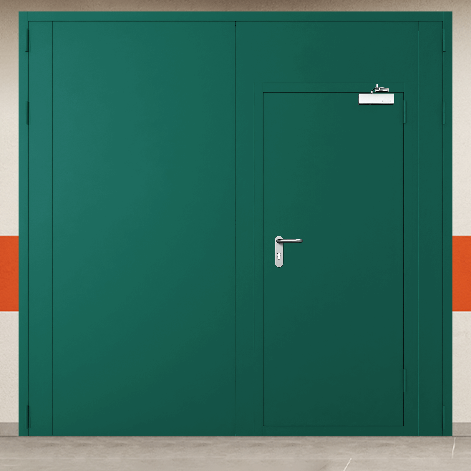 Профессиональное решение для обеспечения пожарной безопасности - ворота металлические двустворчатые зеленые с дверью, блестящей ручкой с сертифицированными характеристиками надежности.