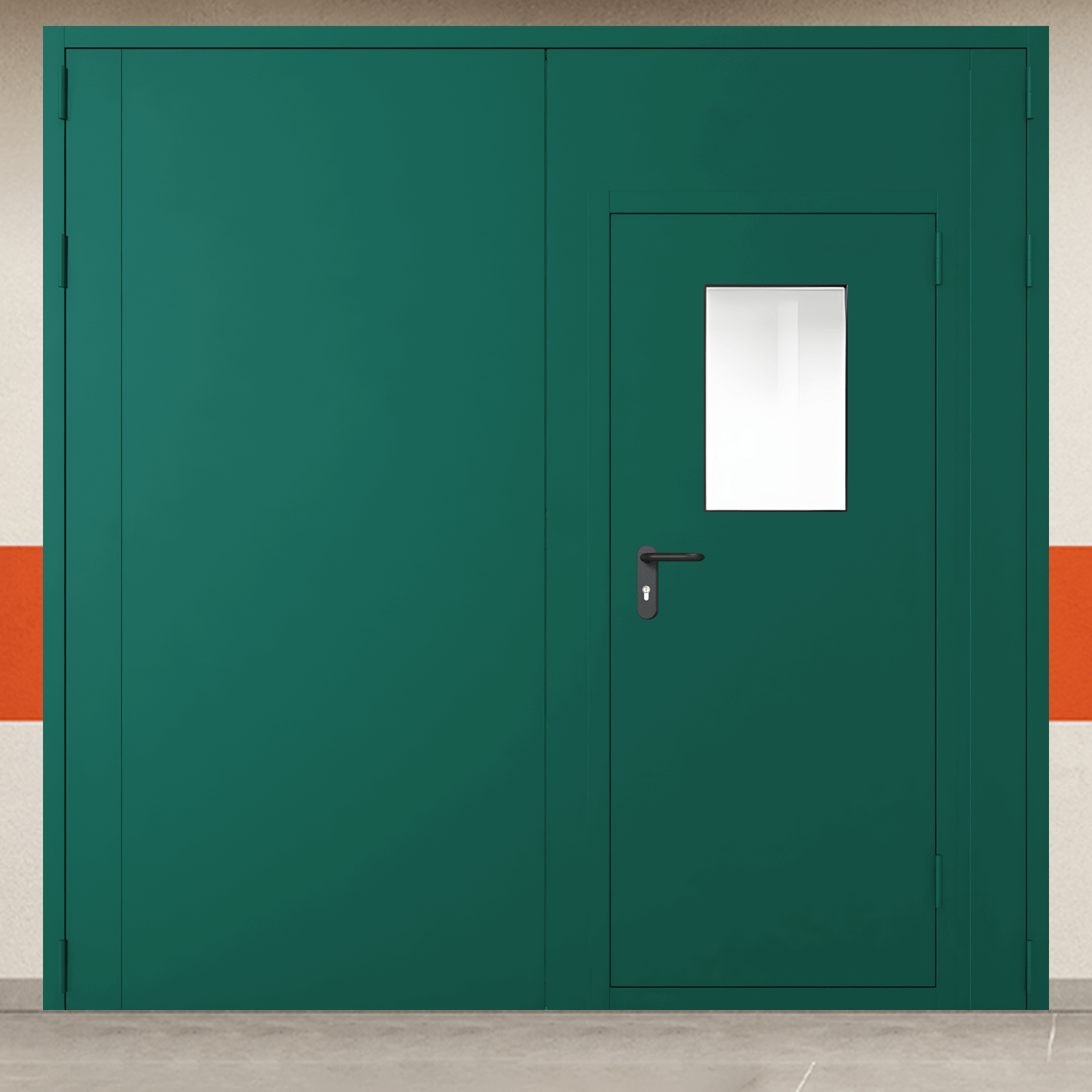 Высококачественное противопожарное оборудование - ворота металлические двустворчатые зеленые с дверью и окном, промышленного класса для систем защиты объектов.