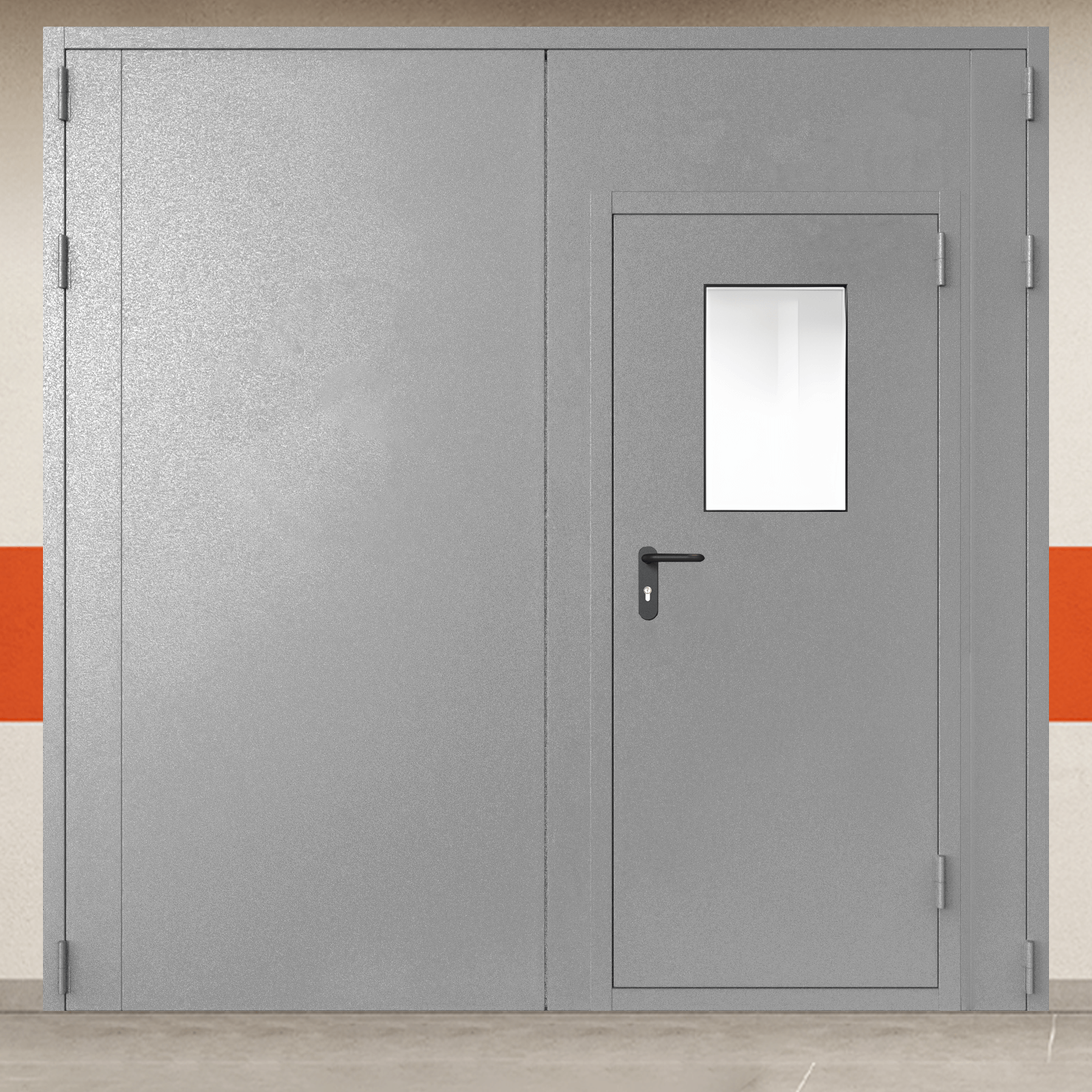 Высококачественное противопожарное оборудование - ворота металлические двустворчатые серые с дверью и окном, промышленного класса для систем защиты объектов.