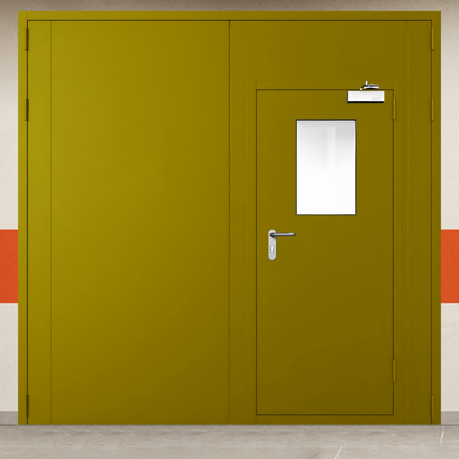 Профессиональное решение для обеспечения пожарной безопасности - ворота металлические двустворчатые желтые с двумя окнами, блестящей ручкой с сертифицированными характеристиками надежности.
