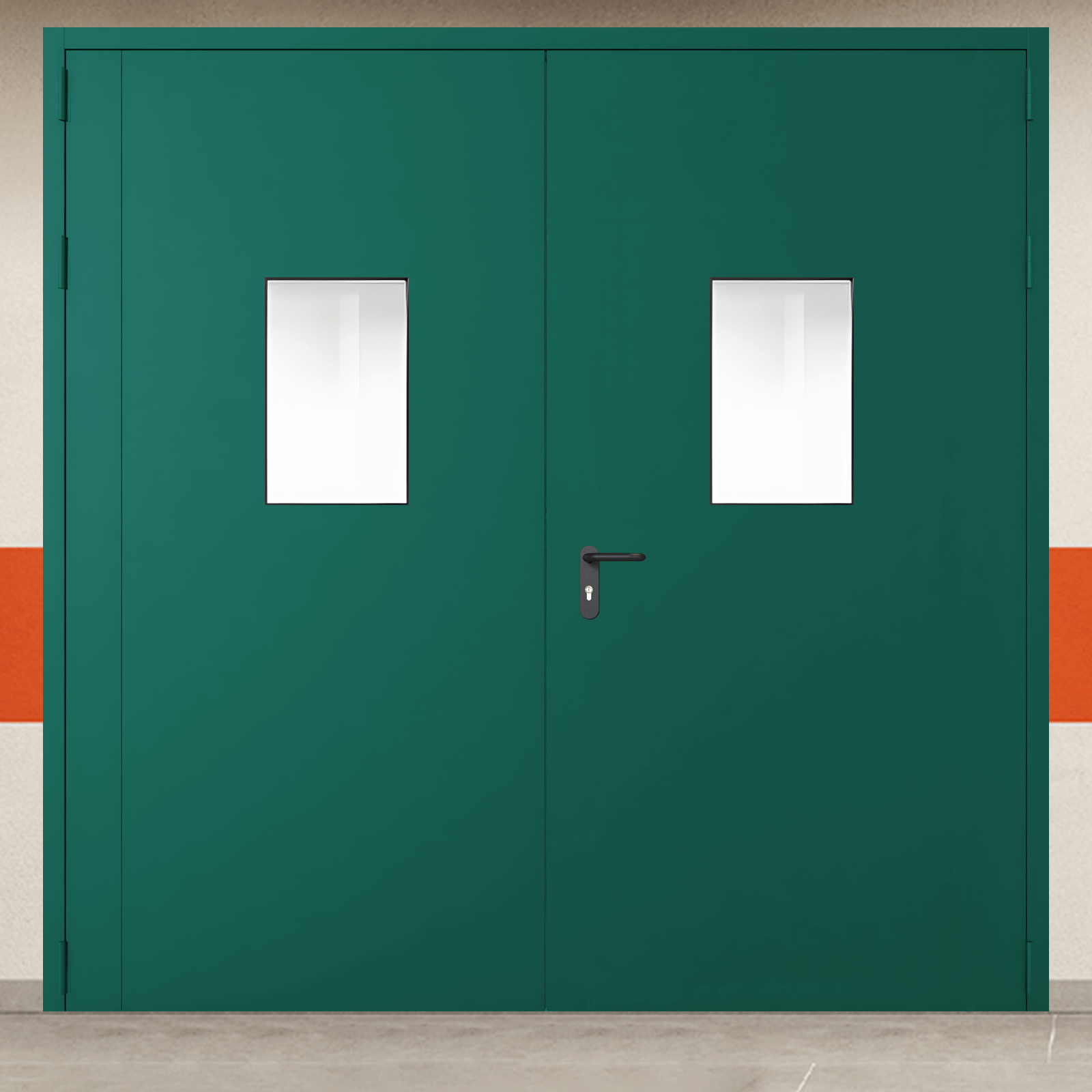 Высококачественное противопожарное оборудование - ворота металлические двустворчатые зеленые с двумя окнами промышленного класса для систем защиты объектов.