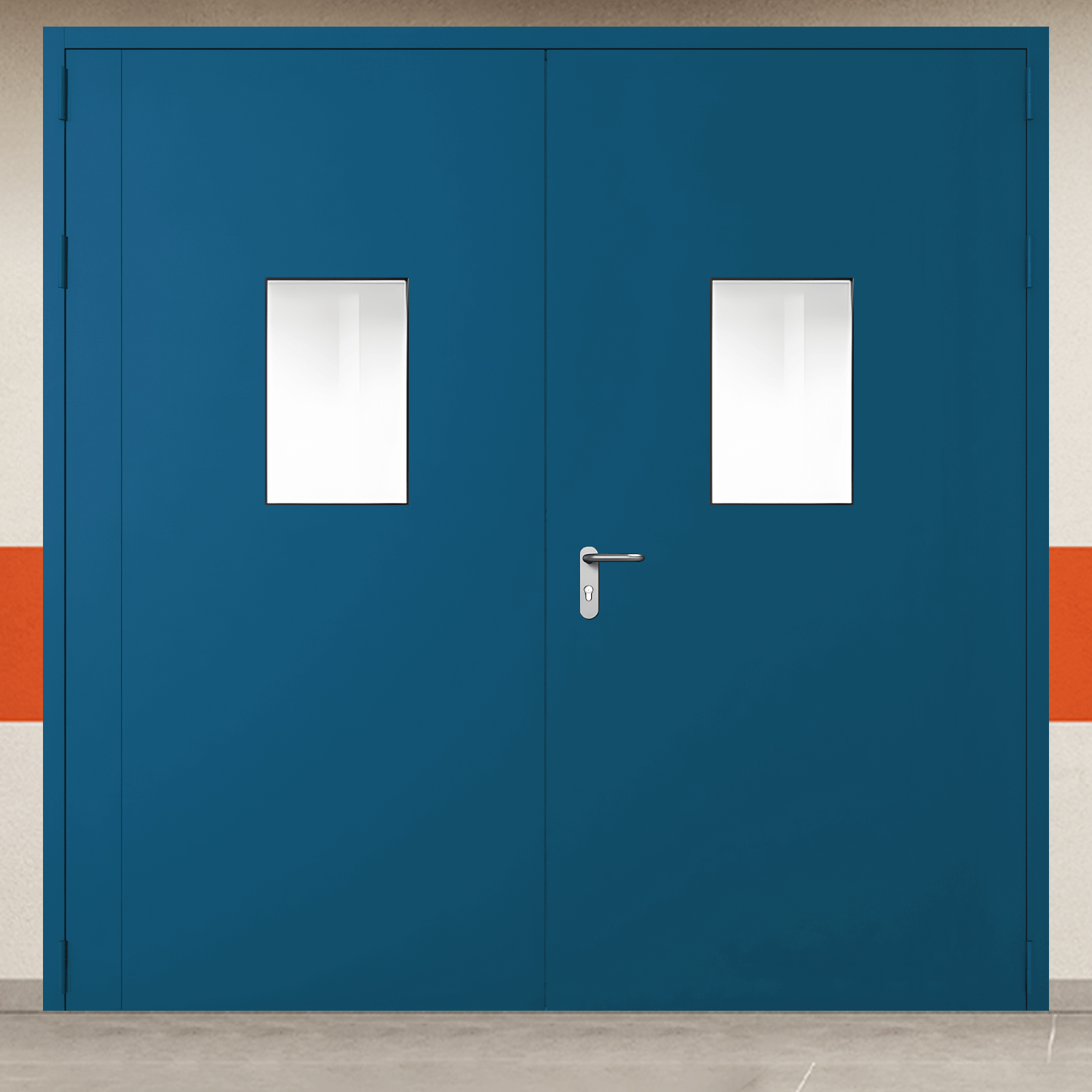 Профессиональное решение для обеспечения пожарной безопасности - ворота металлические двустворчатые синие с двумя окнами, блестящей ручкой с сертифицированными характеристиками надежности.