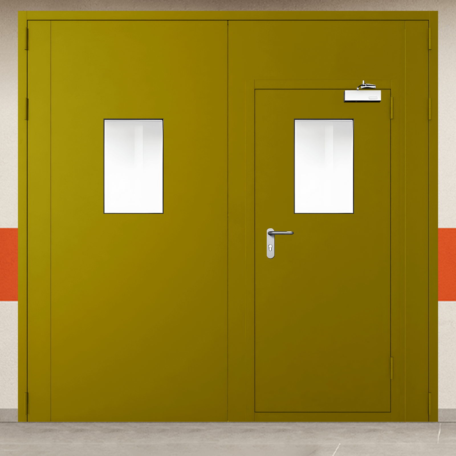Высококачественное противопожарное оборудование - ворота металлические двустворчатые желтые с двумя окнами, блестящей ручкой и доводчиком промышленного класса для систем защиты объектов.
