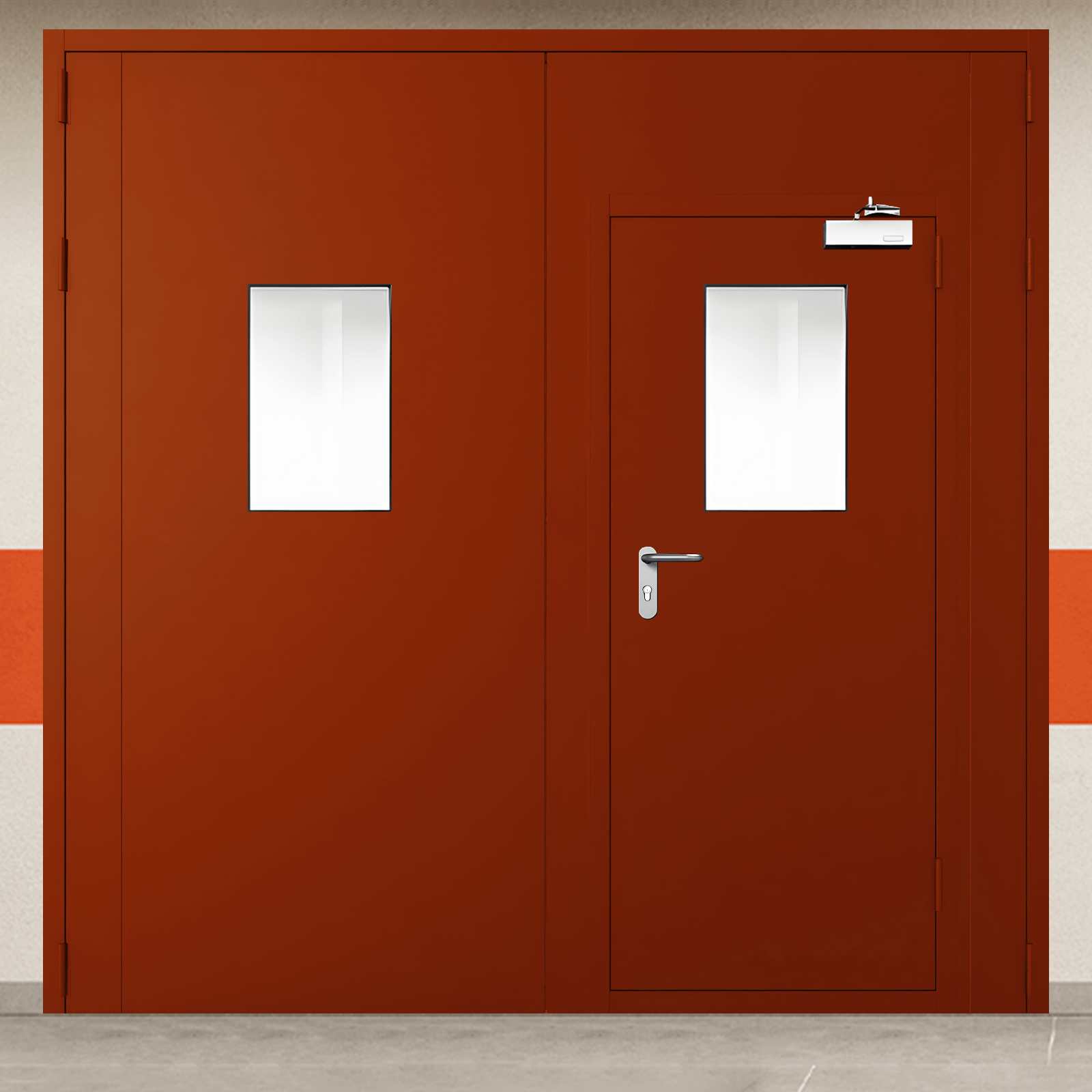 Противопожарные двустворчатые ворота с дверью, двумя окнами и автоматическим доводчиком.
