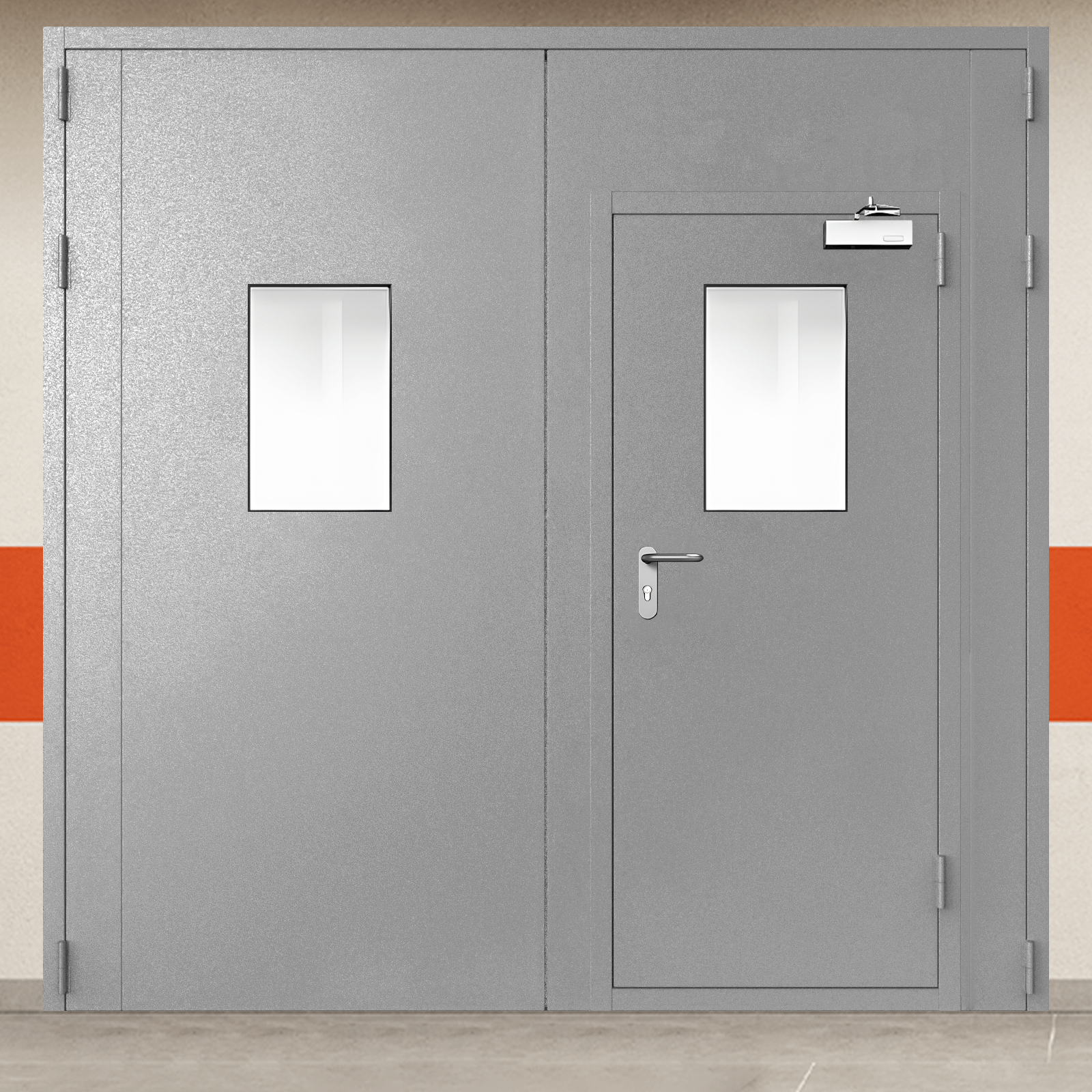 Высококачественное противопожарное оборудование - ворота металлические двустворчатые серые с двумя окнами, блестящей ручкой и доводчиком промышленного класса для систем защиты объектов.