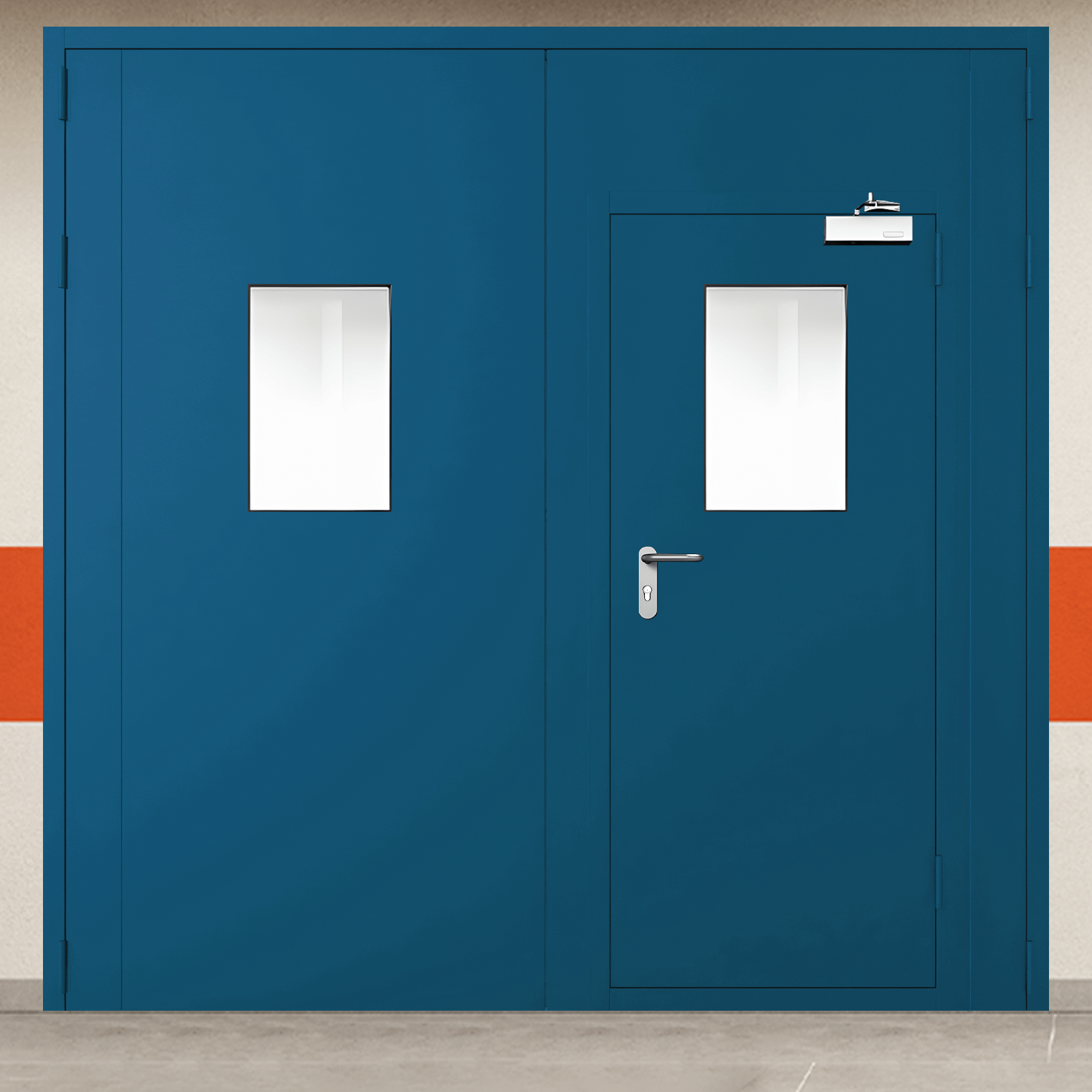 Высококачественное противопожарное оборудование - ворота металлические двустворчатые синие с двумя окнами, блестящей ручкой и доводчиком промышленного класса для систем защиты объектов.